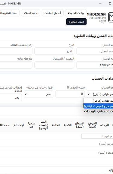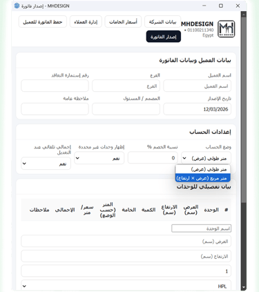 تسعير بالمتر طولي,مربع و عمل فاتوره للعميل و ادارة الحسابات .
