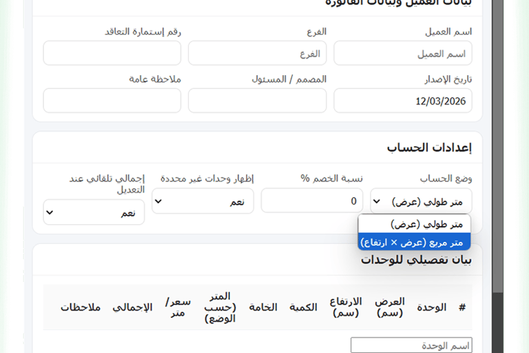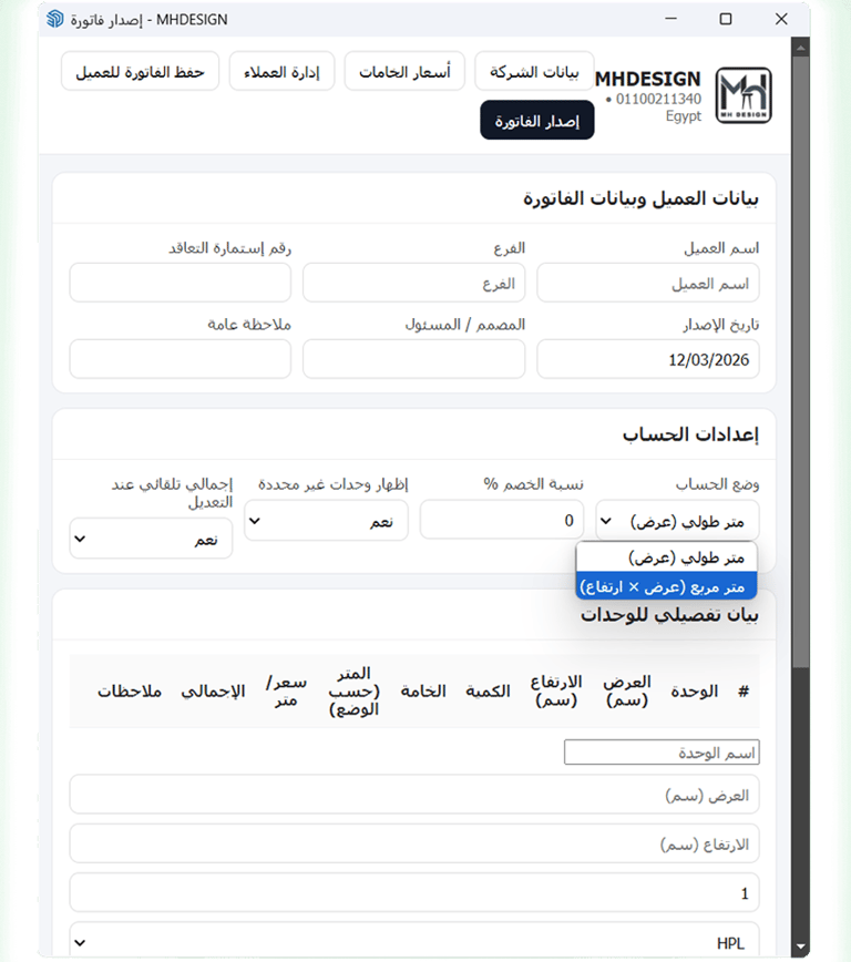 بدل ما تكون المكتبه مجرد كاتلوج وحدات,هي كمان فيها جزء عملي يساعدك في تجهيز الفاتوره و تنظيم بيانات العملاء و الحسابات و تسعير بالمتر الطولي و المربع.