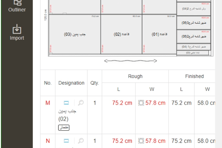 إظهار الأبعاد النهائية والـ Rough / Finished لكل قطعة لتجهيز القص بشكل أدق.